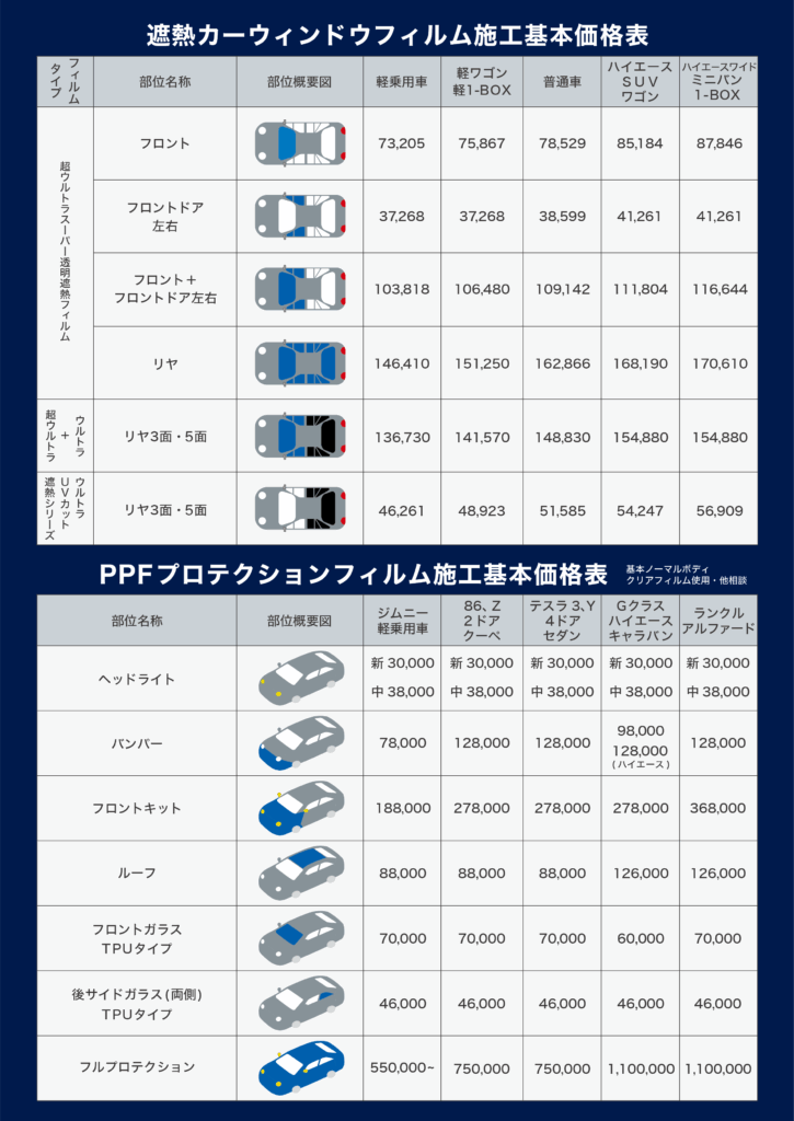 忍者SHIELD-ウィンドウフィルム HOME 忍者SHIELD-ウィンドウフィルム 【鬼影シリーズからウィンドウフィルムが登場!】 その名も…忍者SHIELD! ◇最高の透明度で忍ばせる技! 耐久性10年のタフさと多機能に注目 ◇スモークタイプも武闘派性能! 数値に裏付けされた防御で快適空間へ 【料金表】 ※フィルム代金・施工費込み価格 \すぐ買える鬼影シリーズはこちら/ ⇧⇧⇧【外部サイトへ移動します】⇧⇧⇧ 車種専用カット済・汎用アイテム等販売中です DIY初心者の方でもチャレンジがしやすい! 鬼影プロテクションフィルム 施工代理店募集中! 代理店様へのフィルム販売は大口のため業販価格となり、 通常の販売価格よりお安くなっております。 詳しくはお問い合わせください。