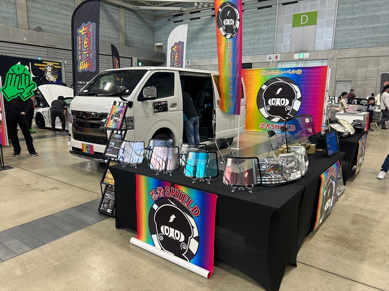 新型ハイエース モデリスタをベースに、最新のウィンドウガラス用フィルムを施工した車両を展示いたしました。このフィルムは、有害な紫外線(UV)や赤外線(IR)から皮膚を守ることを目的として開発された最新技術です。